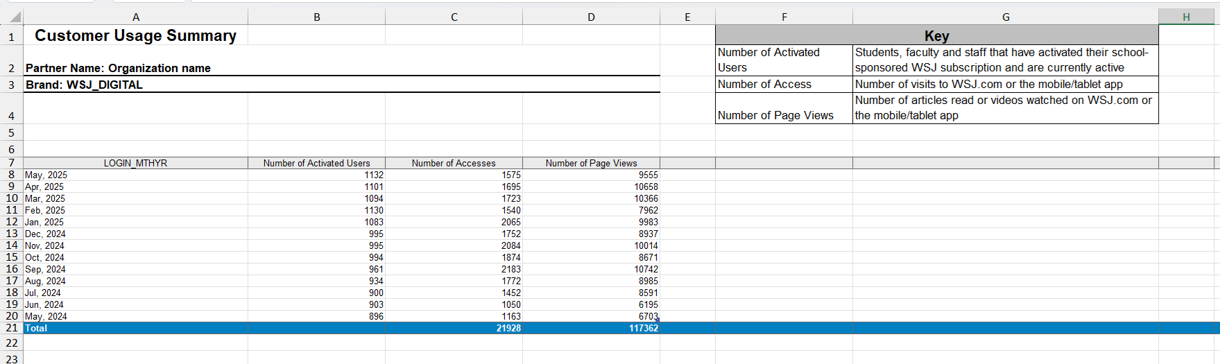 To upload your usage statistics from Wall Street Journal, you can either upload their usage report (see the sample file) or fill out and upload our template (bellow).