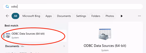 You can check if you have the right version of ODBC driver by opening the Windows Start, start to write "odbc" into search and open ODBC Data Sources.