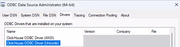 At the “Drivers” tab, you should see ClickHouse ODBC Drivers ANSI and Unicode.