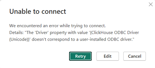 The ClickHouse ODBC driver needs to be installed on your computer. Its absence is indicated by the following error message: