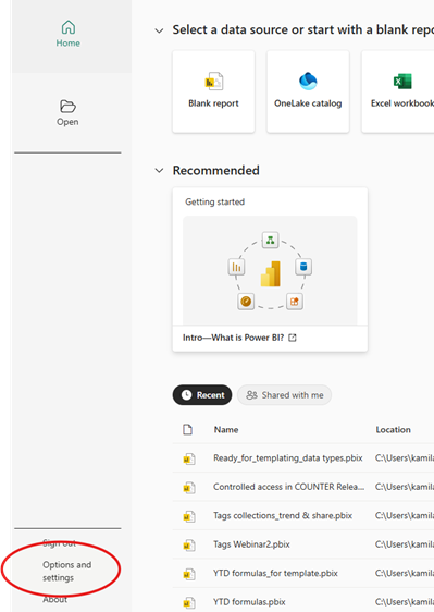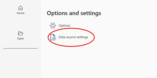 In Power BI, the user names and passwords are stored separately from the data files. To manage them, click on Options and settings at the home screen.