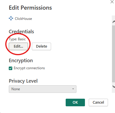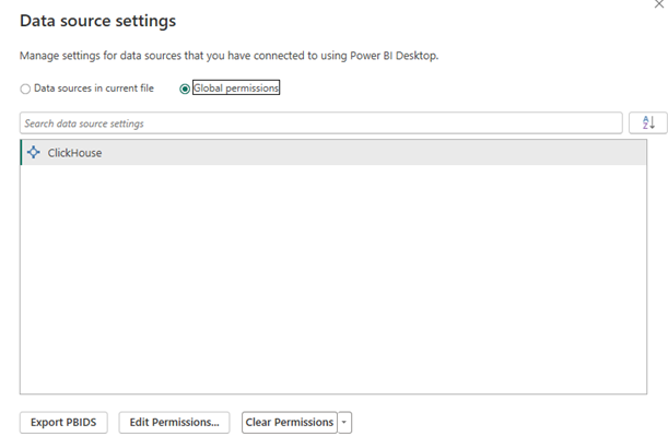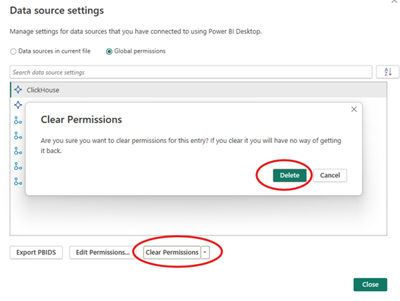 Alternatively, you can remove your credentials by clicking on 'Clear Permissions' and then 'Delete'. You will be prompted to re-enter your username and password the next time you connect from Power BI to the Data Hub.