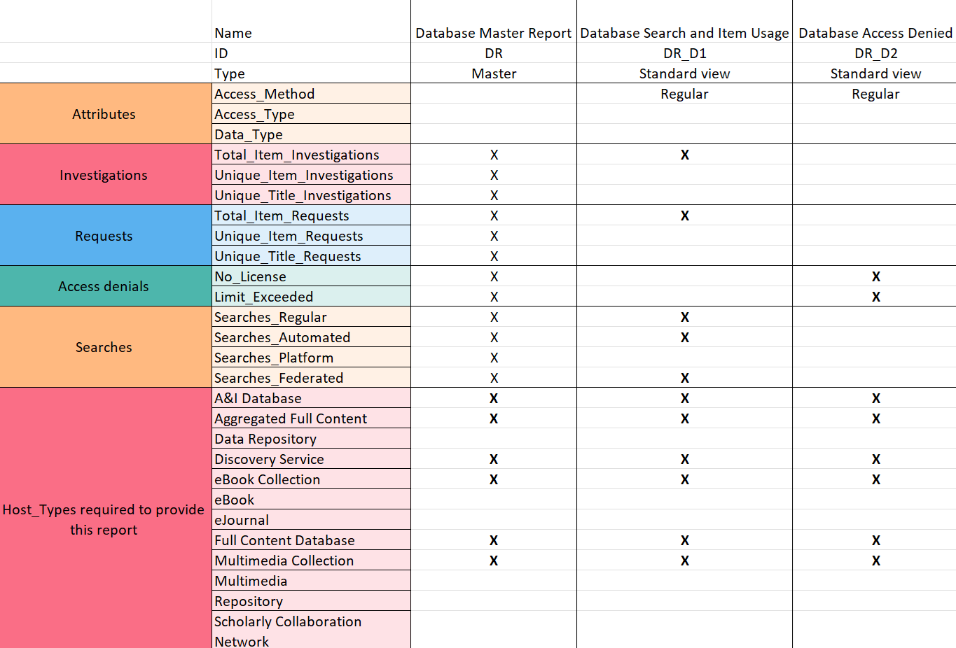This table summarizes the attributes and metrics of the respective reports. Mandatory Metrics and Host_Types are highlighted in bold.