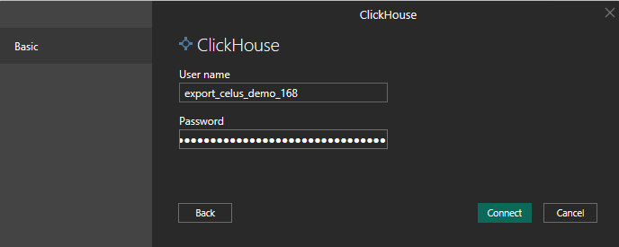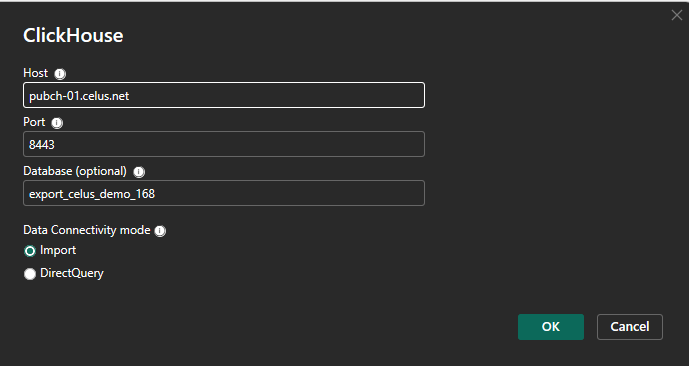 Fill in the information from CELUS and choose Data Connectivity mode Import (data stored in PowerBI file) or DirectQuery (data source remains in Clickhouse).