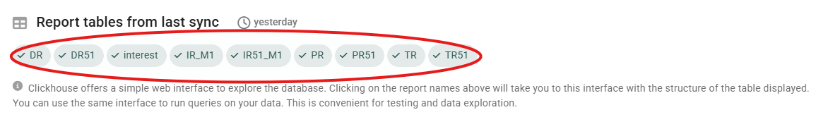 Tip: For easy testing and data exploration, click any report name to open the Clickhouse web interface. This displays the table structure and allows you to run queries directly on your data.