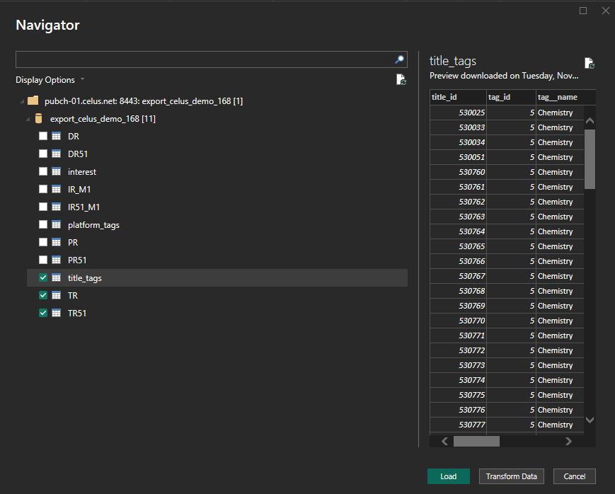 Each report from your CELUS instance is stored in a separate table in the database. For example, if you are harvesting TR, DR and PR reports, you will have three tables in the database with the names TR, DR and PR. COUNTER 5.1 reports have their own tables with the 51 suffix, e.g. TR51. Non-COUNTER reports are exported as well.