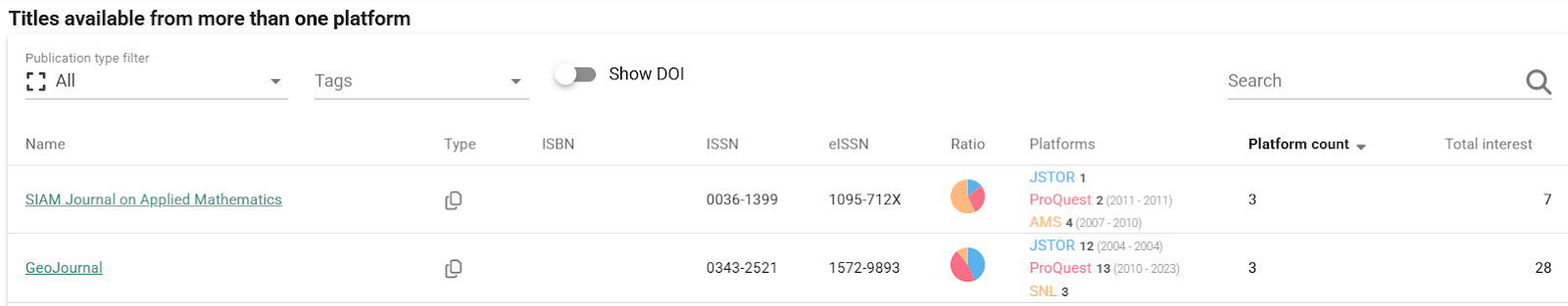 In the example above, we can see that the title "SIAM Journal on Applied Mathematics" was accessed on platforms JSTOR, ProQuest and AMS, similarly the second title “GeoJournal”. Most of the users interacting with “GeoJournal” in the selected date range have accessed it through JSTOR and ProQuest. The total interest, i.e. full text usage of the title is 28, as seen in the last column.